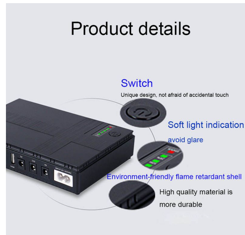 -Mini uninterruptible power supply backup battery pack can power most 12V/9V/5V DC equipment, wireless routers, telephone, LED strip, monitor cameras, etc. It can provide hours of operation during power failure